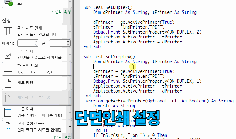 양면 인쇄는 VBA로도 설정하기 까다롭습니다.