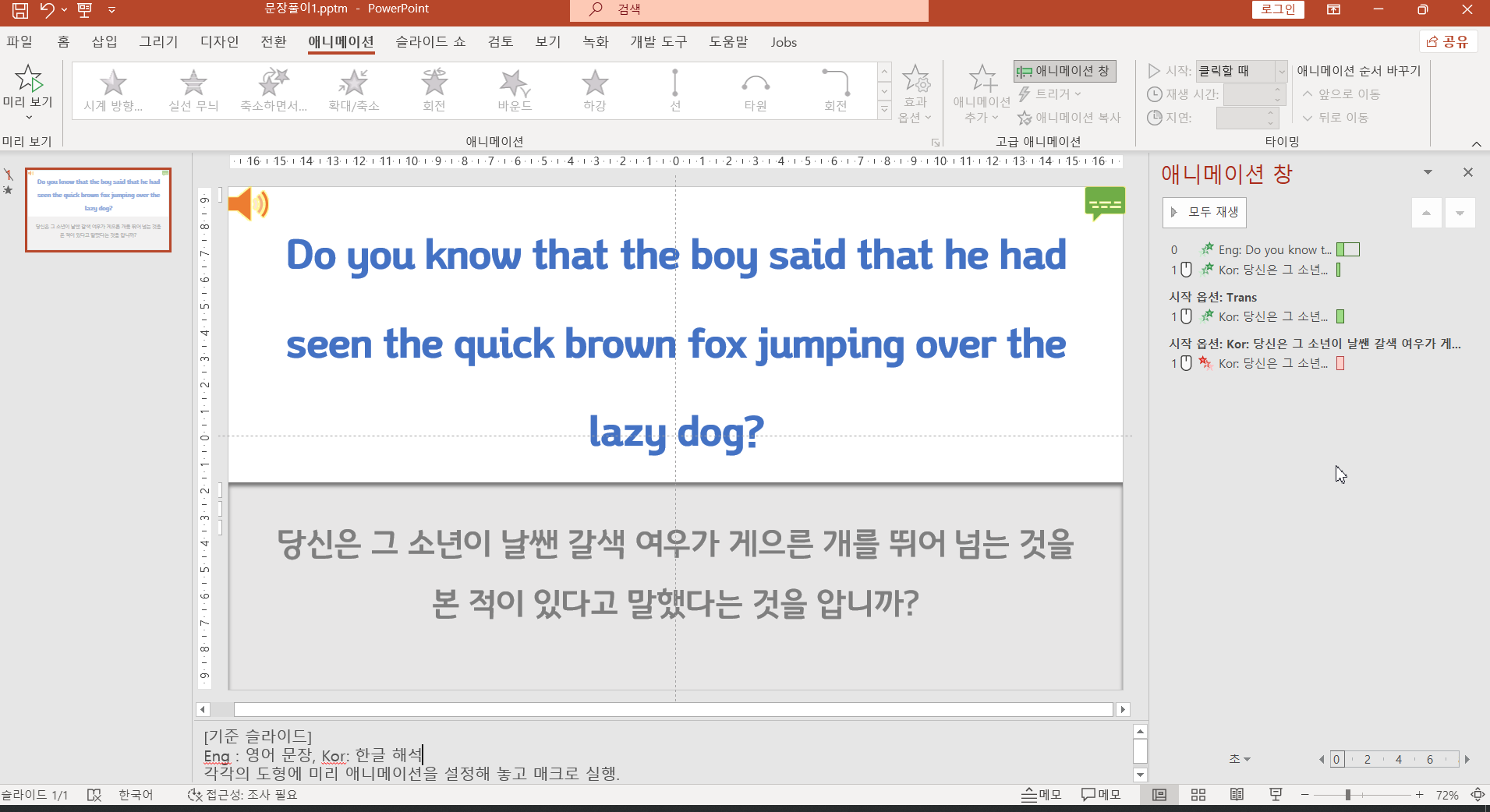 미리 Eng텍스트 상자와 Kor 텍스트 상자에 애니메이션을 적용해 놓으세요.
