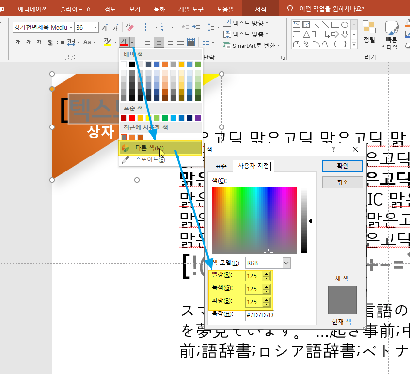 파워포인트에서 텍스트의 폰트는 기본 폰트이름과 함께 Ascii 폰트이름, 극동아시아 폰트 이름, ComplexScript 폰트이름, Symbol 폰트이름, 기타 폰트 이름 등을 적용할 수 있습니다. 한글폰트는 NameFarEast라는 항목으로 적용하는데 해당 폰트가 적용될 수 없는 경우는 반영되지 않습니다. 특히 일부 글자만 들어 있는 폰트를 다른 폰트로 변경하는 경우 특수문자에 대한 폰트가 없는 경우 새로운 폰트로 바뀌지만 내부적으로 ComplexScript 폰트같은 것이 기존 폰트 이름으로 남게 됩니다.