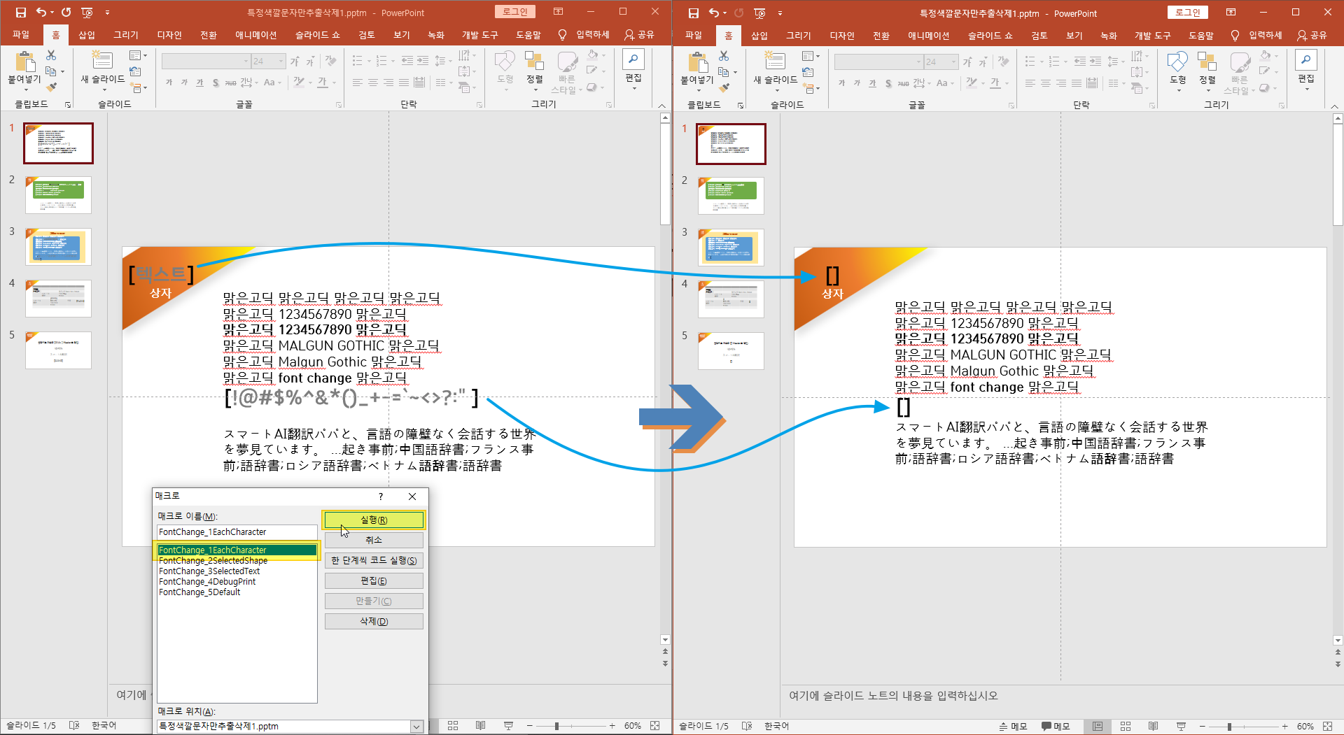 또는 슬라이드 전체의 폰트를 일괄로 변경하는 매크로를 만들어 봤습니다.