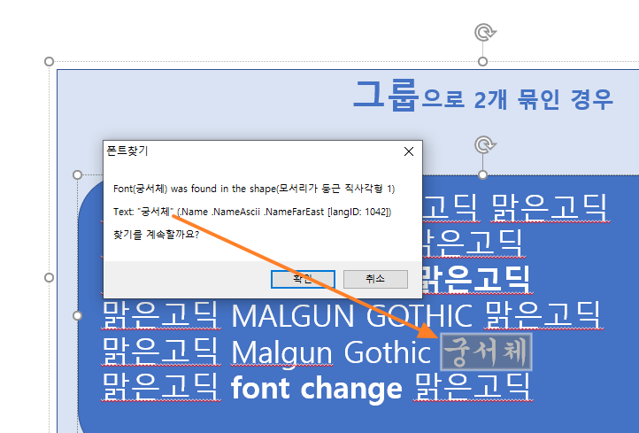 첨부한 VBA는 슬라이드에서 '궁서체'폰트로 작성한 개체(도형)를 찾아줍니다.
