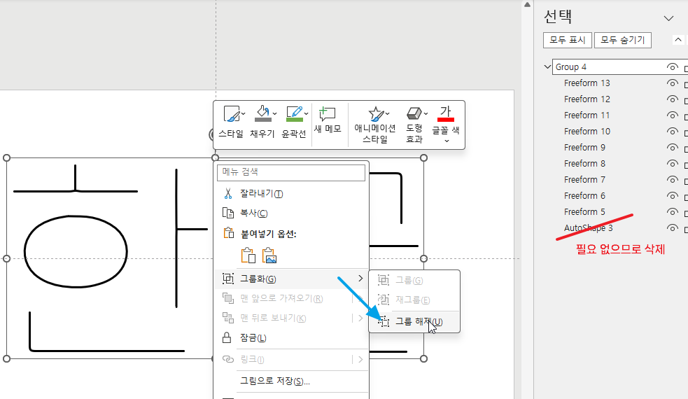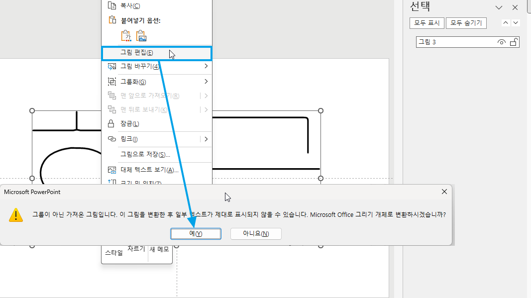 다시 우클릭해서 '그림 편집'을 누르고 오피스 도형으로 변환하고 그룹을 해제합니다.