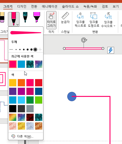 파워포인트 2019 이상에서는 새로운 그리기 메뉴가 있고 여러가지 펜 및 잉크 기능이 소개되었습니다.