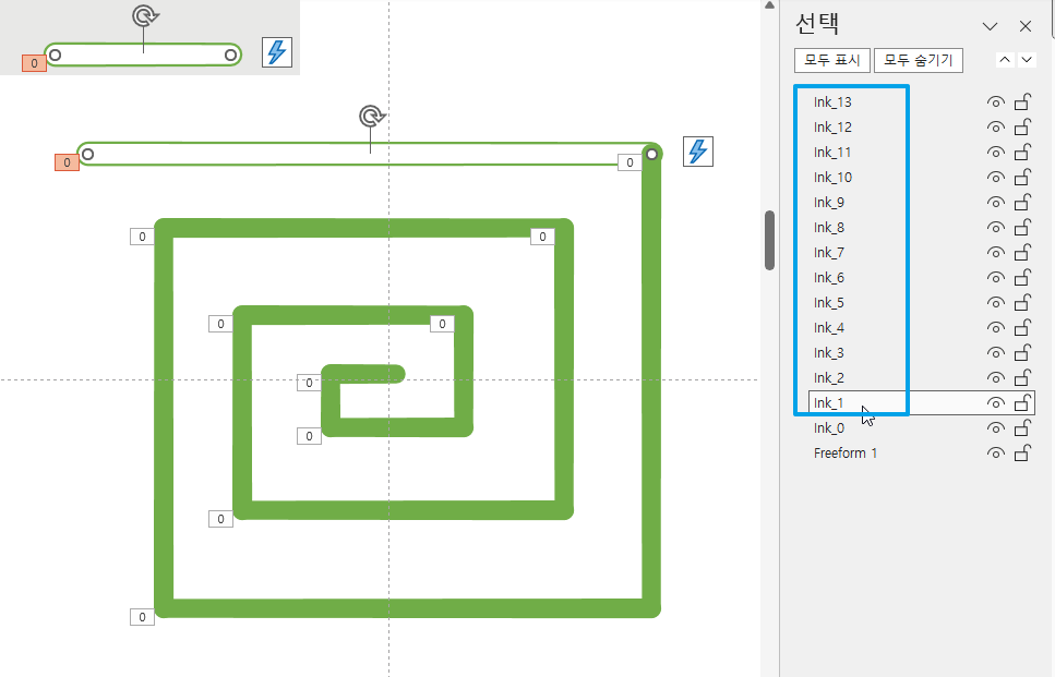 4. 아래와 같이 Ink_0 이라는 기본 잉크 도형이 미리 그려놓은 Freeform 도형의 노드(점)을 따라서 여러 획으로 생성되었습니다. (VBA로 Ink모양을 추가할 때 InkML 이라는 InkXML 형식으로 잉크를 추가(Shapes.AddInkFromXML)할 수 있는 것 같은데 자세한 InkML 문법이 알려져 있지 않아 일단은 이렇게 기존 잉크를 복사해서 조절하는 방식으로 해결해보았습니다.)