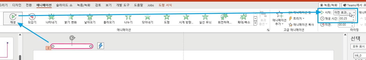 그리고 애니메이션에 '재생' 효과를 적용하고 시작:은 '이전 효과 다음에'로 그리고 재생시간을 0.25초~1초 등으로 설정합니다. 이 잉크선을 복사해서 자유형 도형의 node(점)을 따라서 각도와 크기를 조절해줄 예정입니다.