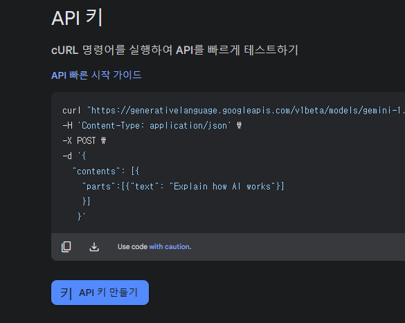 위 사이트에 자신의 구글 계정으로 로그인해서 'API 키 만들기'를 클릭하여 API 키를 생성하고 복사합니다.
