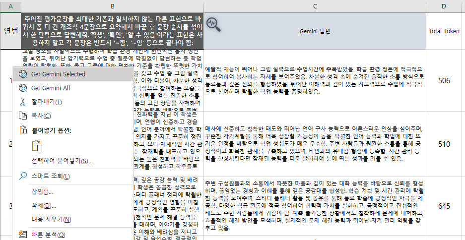 - 일부 셀만 답변을 가져올 때는 우클릭 메뉴에서 GetGenaiResultFromSelection 을 이용하세요.