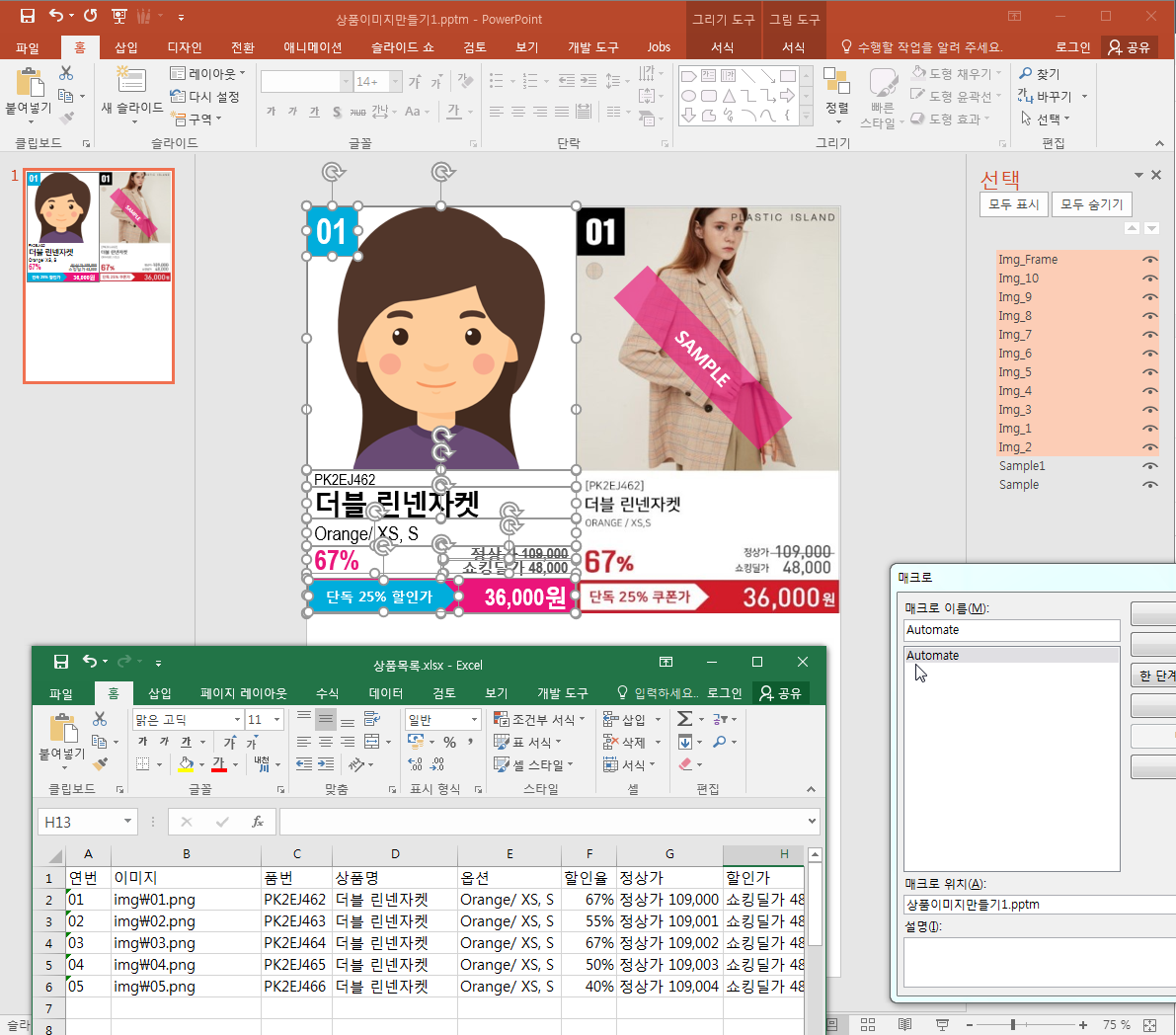 그래서 엑셀 목록과 연동하여 파워포인트에서 슬라이드상의 이미지를 조합하고 모여진 도형들을 그림으로 저장하는 식으로 연동된 자동화작업을 처리하면 됩니다.
