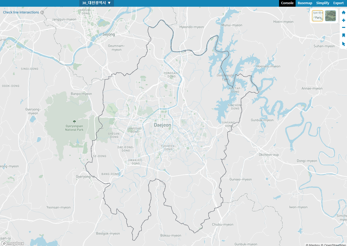 1. Add File 누르고 대전광역시 GeoJson 데이터를 업로드하면 행정동경계가 나타납니다.