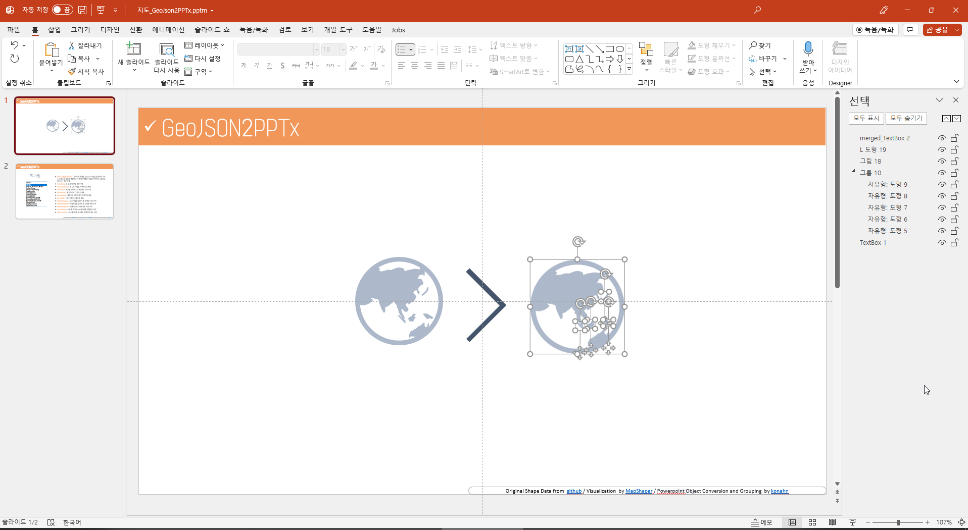 오피스 도형으로 변환 후에 그룹을 해제합니다.