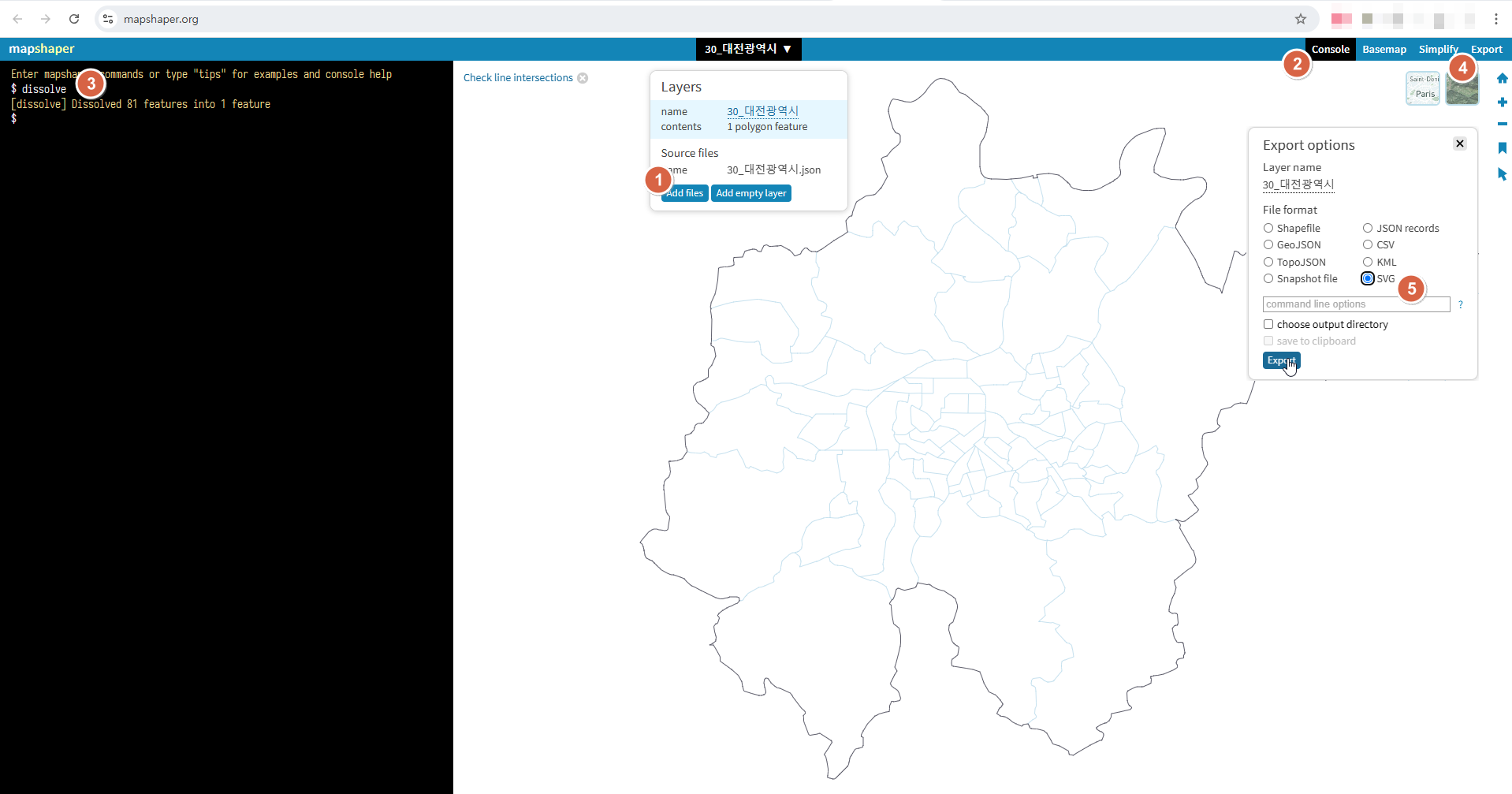그리고 json데이터를 mapshaper 사이트에서 SVG로 변환하였습니다.
