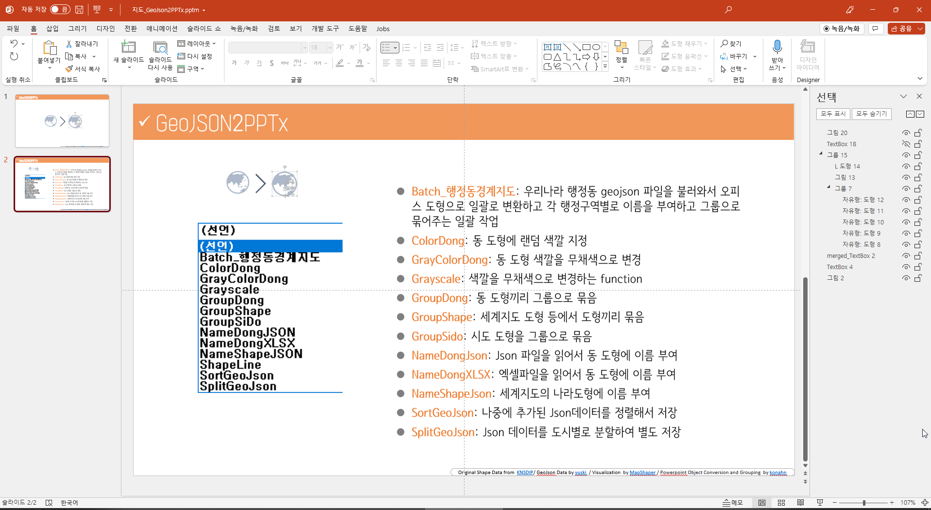 우리나라 행정동과 세계지도를 pptx로 변환하는데 사용된 VBA함수들입니다. 지도의 경계구역을 벡터 좌표로 저장한 GeoJson파일을 SVG이미지로 변환한 뒤에 ppt에 불러와서 다시 ppt도형으로 변환하고 도형에 이름을 부여하고 그룹으로 묶을 때 사용된 VBA를 모은 것입니다.