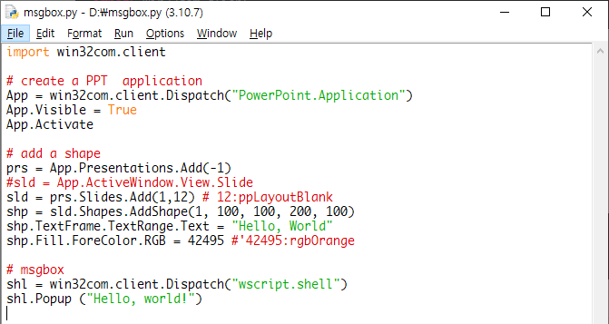 위 파일이 하는 일은 프리젠테이션을 하나 추가하고 1슬라이드에 주황색 네모를 추가하고 Hello World메시지를 출력합니다. 단, win32com이 설치되어 있어야 합니다.