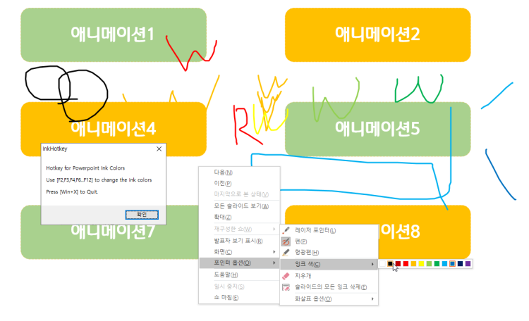 그런데 전체화면 슬라이드쇼에서는 잉크색을 바꾸는 것이 쉽지 않습니다.