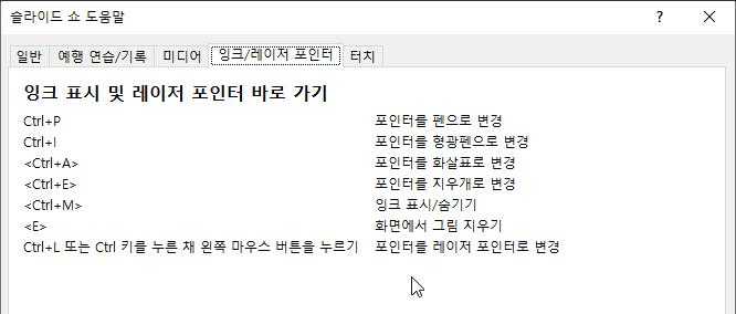 참고로 슬라이드쇼 도중 사용할 수 있는 잉크 관련 단축키입니다.