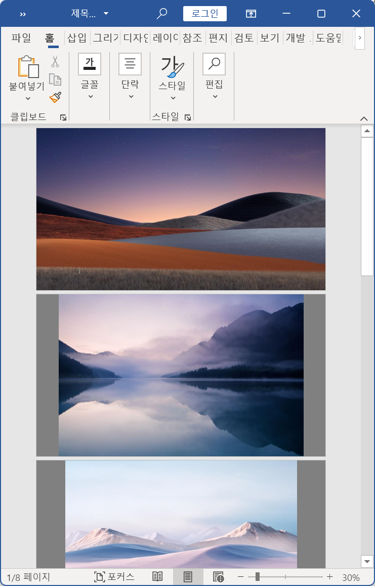 워드 문서의 1페이지마다 사진(또는 사진 설명 포함)을 하나씩 일괄로 삽입하는 방법입니다.
