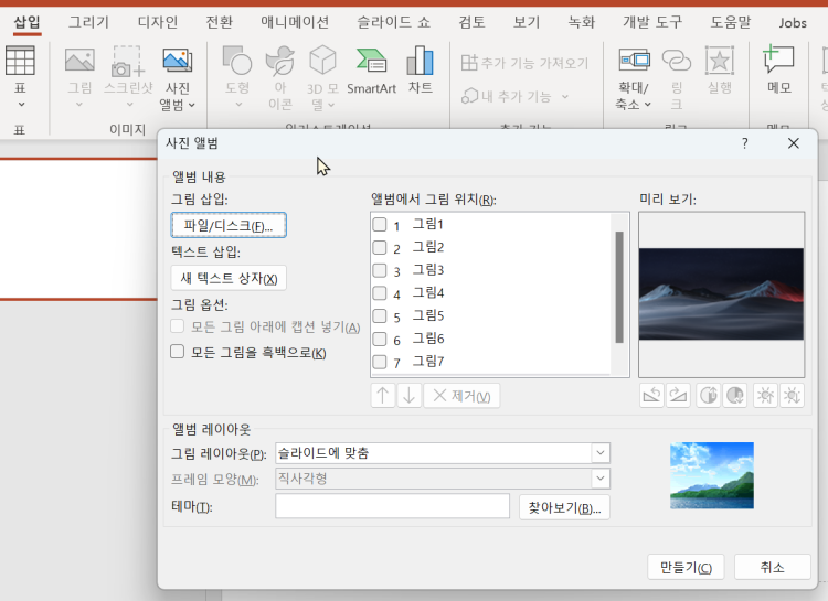 1. 파워포인트에서 삽입 > 사진 앨범 기능으로 사진 100장 일괄 삽입