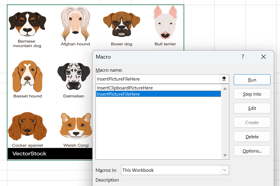 코드창을 닫고 원하는 셀을 선택하고 Alt+F8누르고 InsertPicureFileHere 를 실행해서