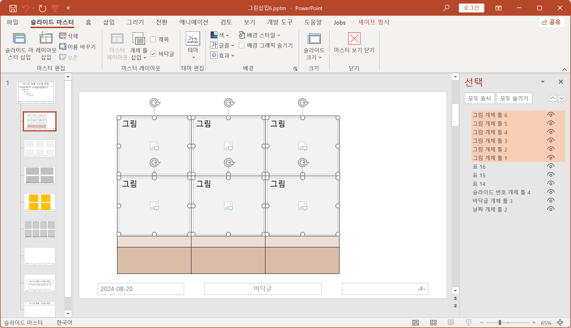 그림 개체트 6개를 첫번째 슬라이드 마스터 레이아웃에 넣어두고