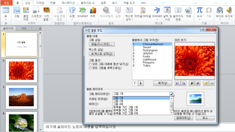 사진을 일괄 삽입할 수 있고, 그림도형의 서식을 바꿀 수 있어 좀더 유연한 방법입니다.