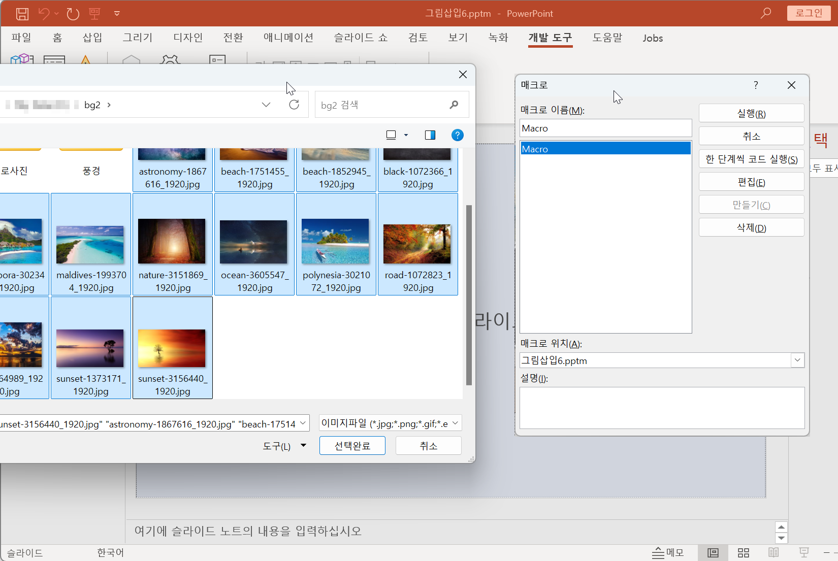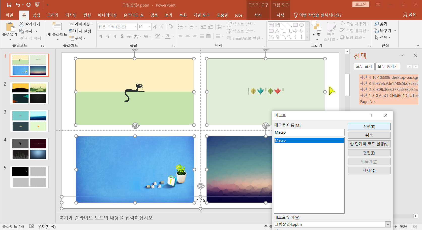 Alt-F8누르고 매크로를 실행해서 사진들을 선택하면 됩니다.