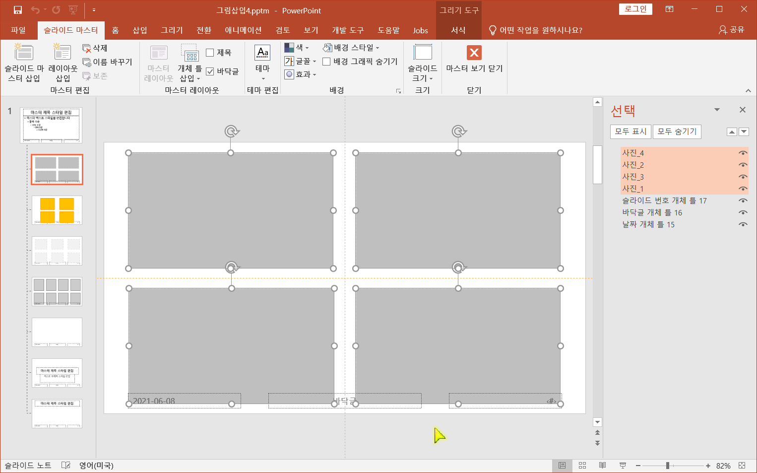 보기 - 슬라이드마스터의 첫번째 레이아웃의 '사진_x' 도형이 중요합니다.