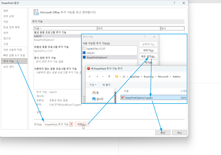 파일 > 옵션 > 추가기능 > Powerpoint추가기능 > 이동> 새로 설치 에서 KeepPrintOptions1.ppam을 찾아서 설치