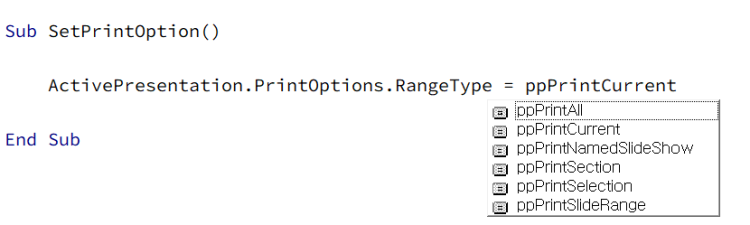 만일 VBA를 이용하자면 아래와 같은 명령으로 현재 슬라이드만 인쇄하게 인쇄 옵션을 설정할 수 있습니다.