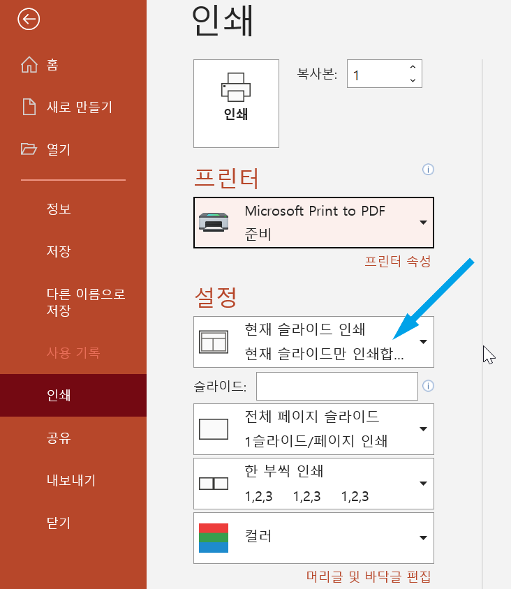 인쇄 설정을 바꾸려면 사용자가 아래처럼 인쇄 옵션에서 '현재 슬라이드 인쇄'로 설정을 바꿔줘야 합니다.