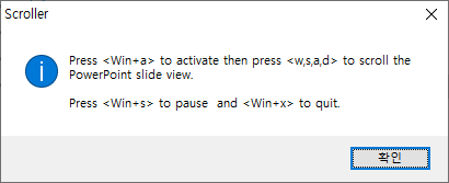 MsgBox, 0x40, Scroller, Press <Win+a> to activate then press <w`,s`,a`,d> to scroll the PowerPoint slide view.`n`nPress <Win+s> to pause and <Win+x> to quit.