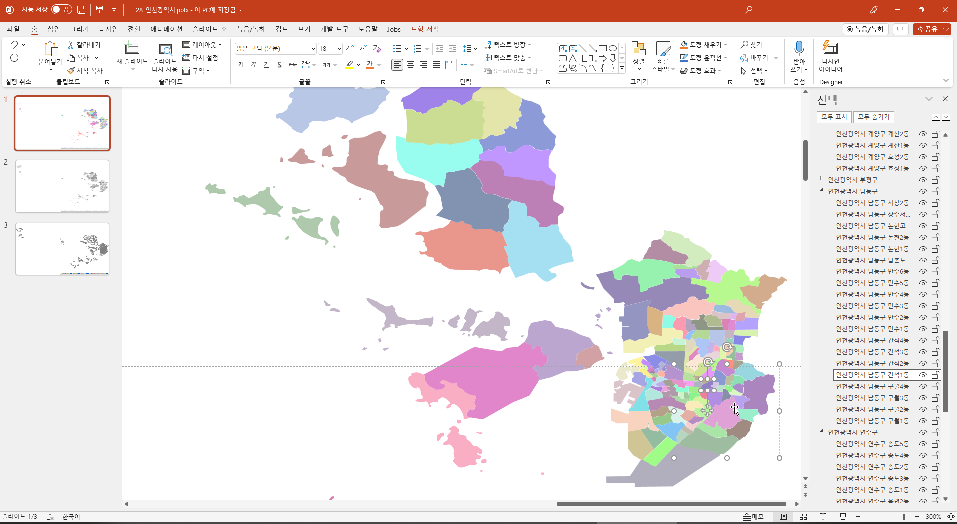 각 동이나 구별로 색깔을 랜덤으로 채운 작업결과물입니다.