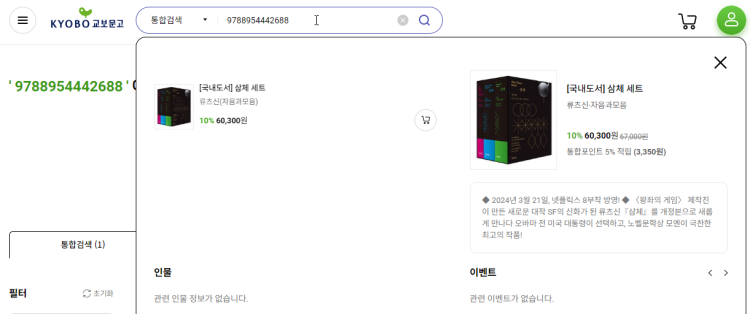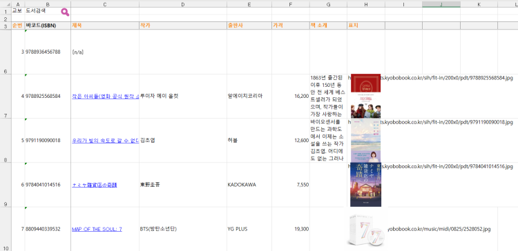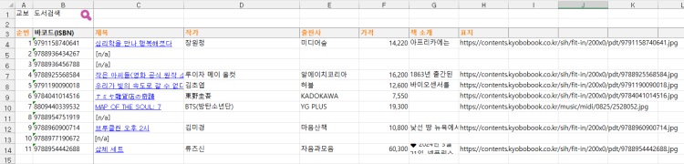 교보문고에서 검색할 때 판매중인 자료는 실시간으로 간단한 데이터들을 Json형식으로 가져옵니다.