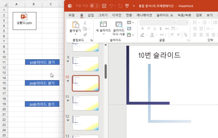 클릭시 개체를 열고 편집화면에서 10슬라이드로 이동합니다. (슬라이드쇼로 열고 이동도 가능)