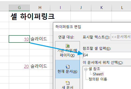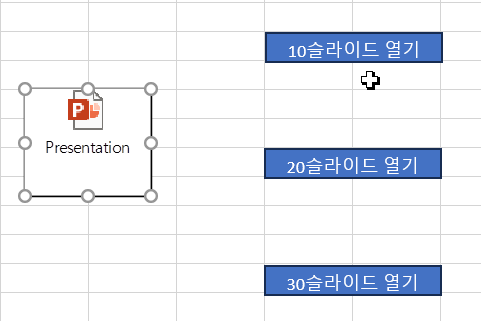하이퍼링크가 걸린 셀의 텍스트에서 10, 20, 30이라는 숫자를 가져와서 슬라이드를 이동시킵니다.
