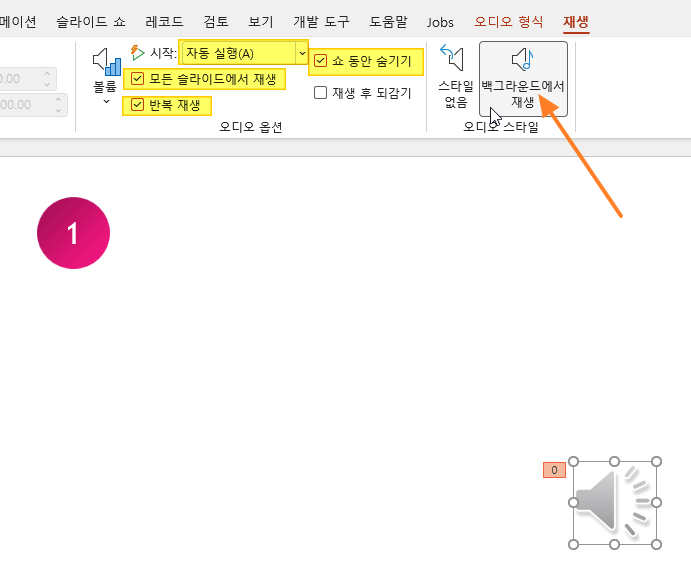 백그라운드에서 재생 버튼이 없다면 수동으로 '자동재생', '모든 슬라이드에서 재생', '반복재생' 등에 직접 체크해주세요.