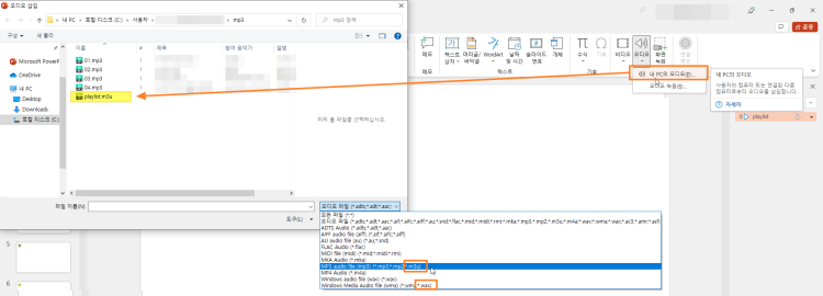 mp3나 wav등의 오디오를 한 개씩 슬라이드에 넣을 수 있는데