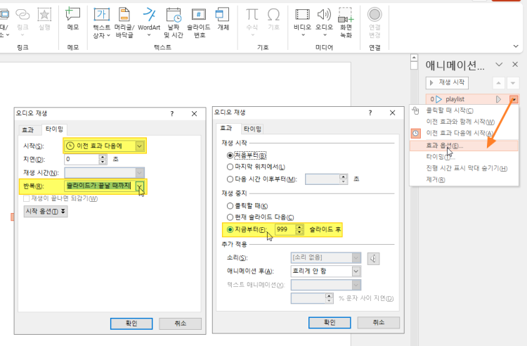 애니메이션 탭을 열고 playlist 재생 애니메이션효과의 효과옵션에서 세부 옵션을 지정해줄 수도 있습니다.
