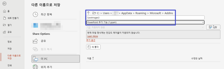 파일 > 다른이름으로 저장에서 ppam 으로 저장합니다.