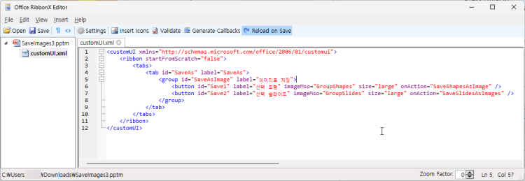 1. RibonX Editor 에서 Open을 누르고 SaveImages.pptm 을 불러옵니다.
