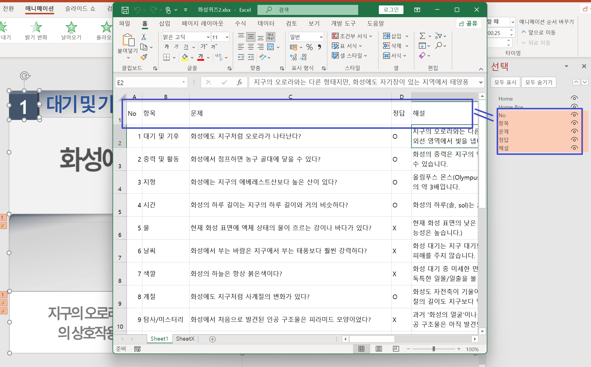 엑셀 제목줄의 카테고리 항목은 원하는 만큼 추가해도 되고 그에 따라 1번 문제 슬라이드에도 항목 이름과 일치하는 도형이 있어야 합니다.