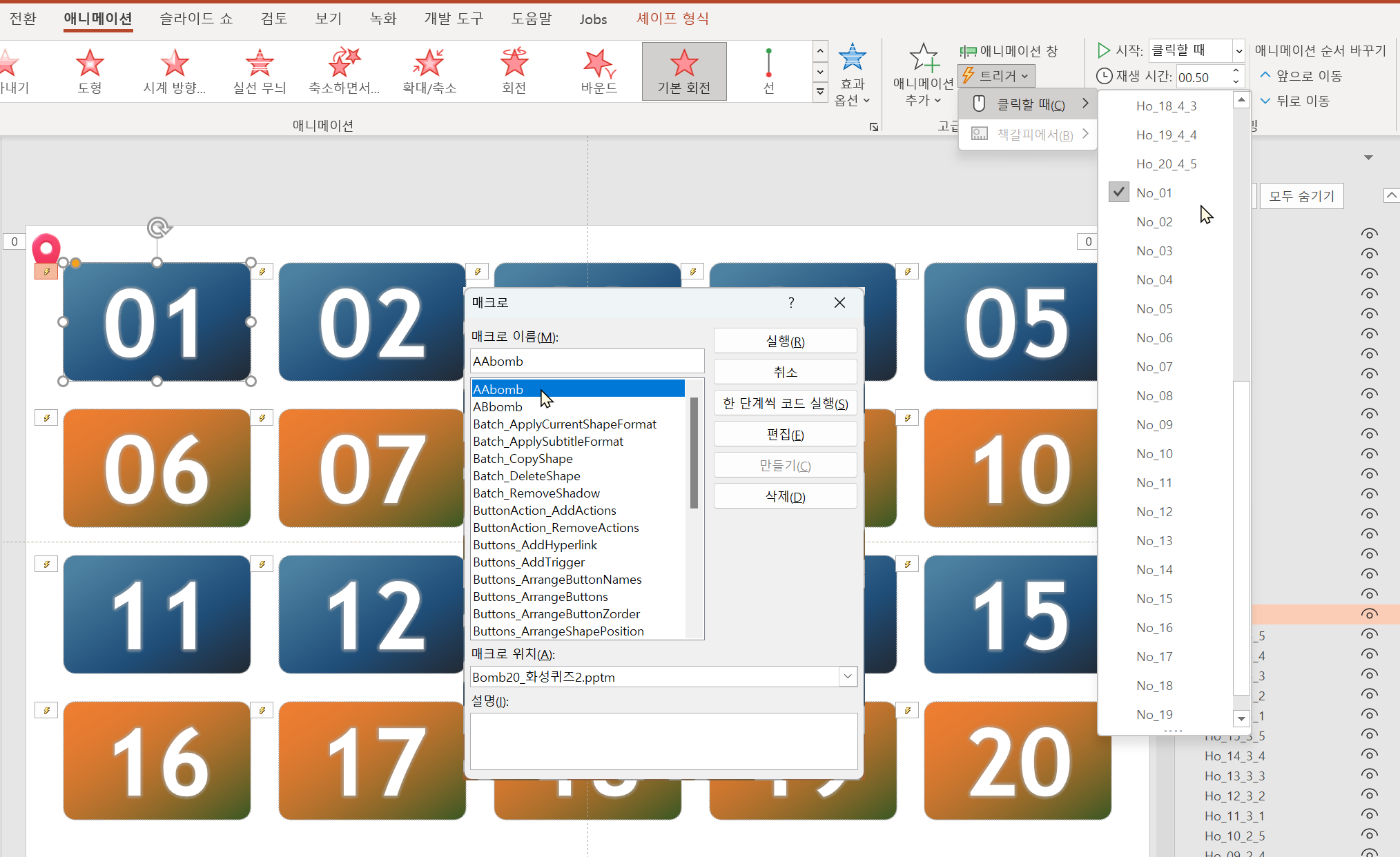 가장 먼저 매크로중 AABomb 를 실행하면 현재 슬라이드에 원하는 가로*세로 개수의 버튼을 생성합니다.