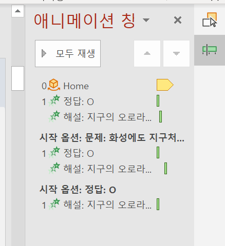아래처럼 애니메이션을 설정해놓으면 나머지 슬라이드에도 똑같이 적용됩니다.