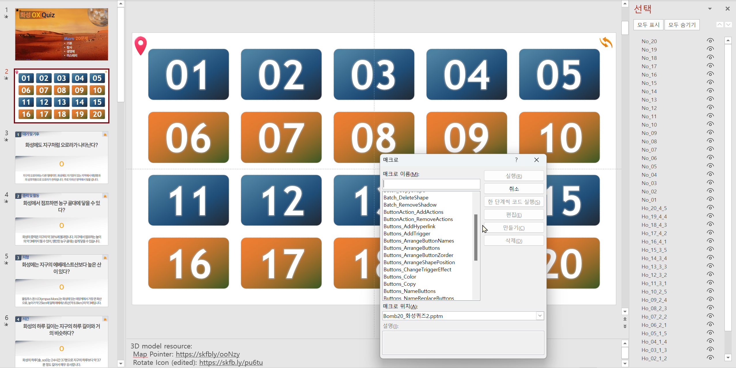 번호 도형생성, 엑셀에서 문제 슬라이드 생성, 하이퍼링크, 트리거 애니메이션 등의 과정은 VBA를 이용해서 자동화해서 만들었습니다.