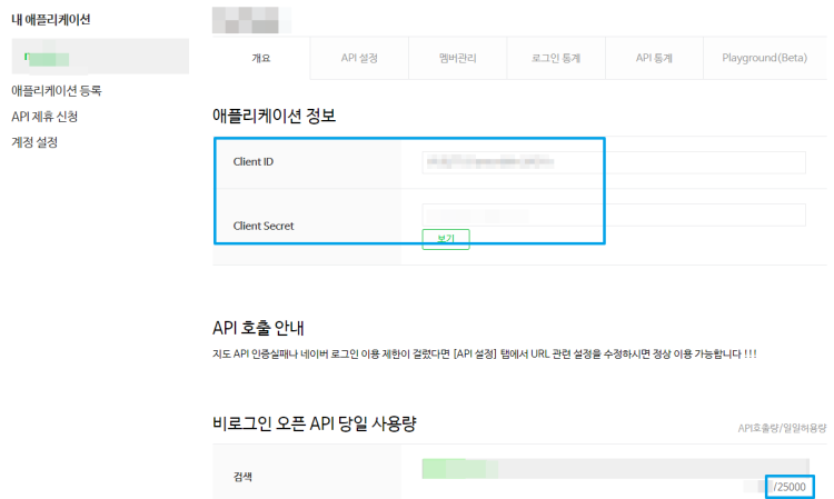 이제 Client ID와 Client Secret 이 발급되었습니다. 잘 복사해 놓으세요. 하루 할당량은 25,000회로 제한됩니다.