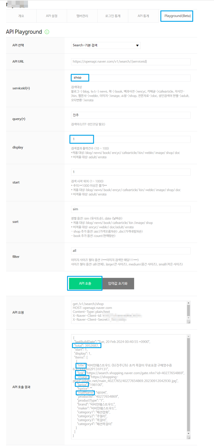 여기서는 참고로 Display=1로 하나의 품목만 검색해서 그 결과도 출력하도록 했습니다.