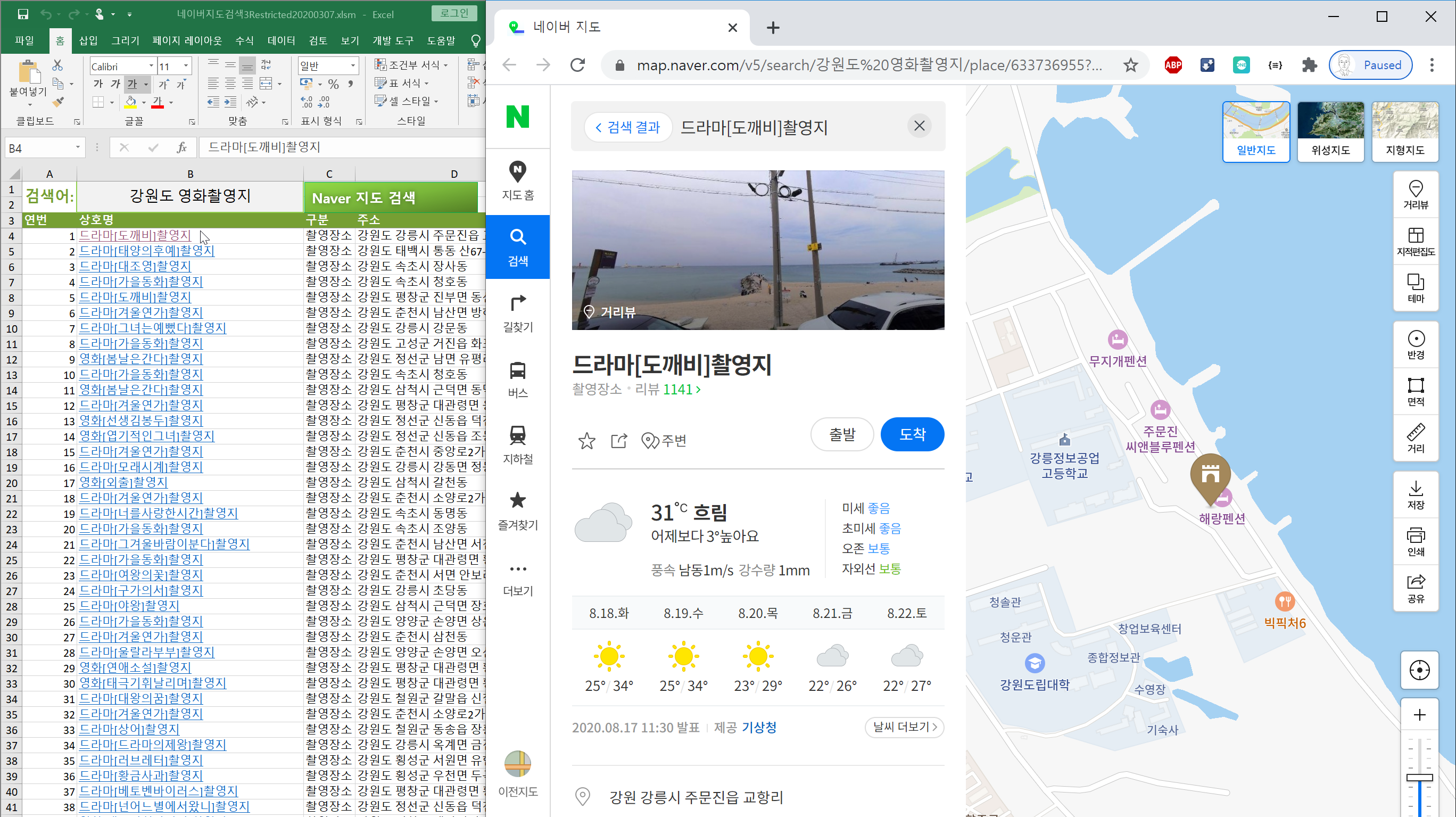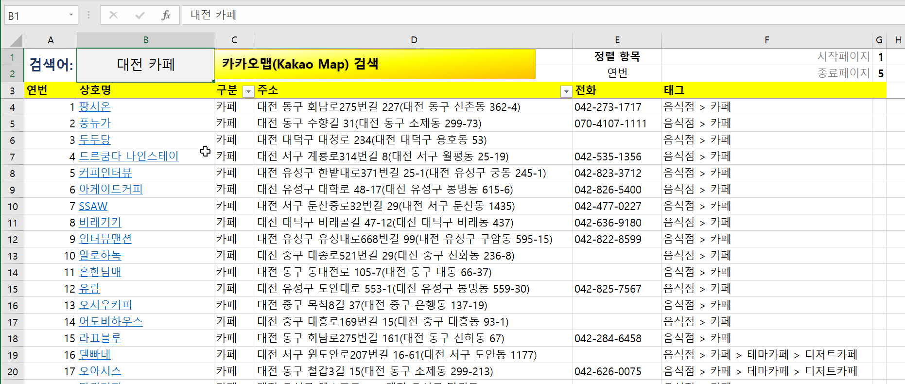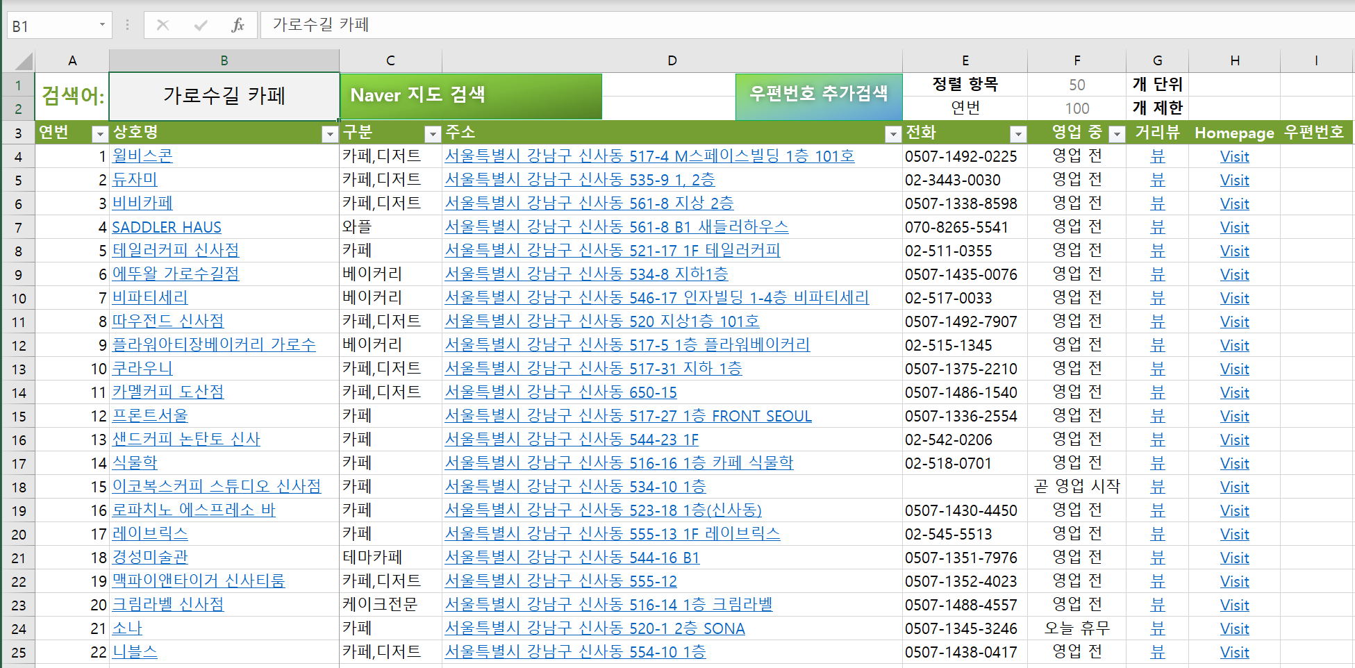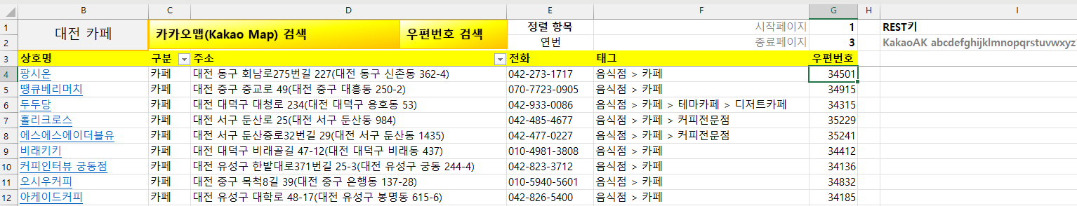 카카오맵은 정식 API키를 발급받아 [I2]셀에 입력해서 사용해야 합니다.