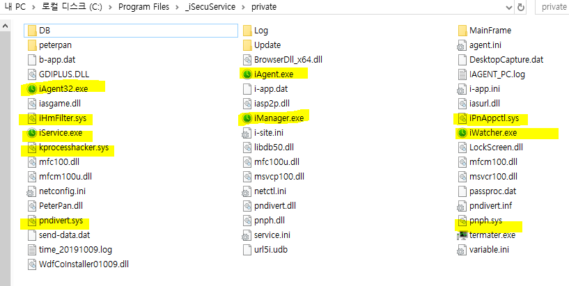 메모리상에서 iManager, iService, iAgent/iAgent32, iWatcher.exe등 PC가드관련 EXE파일과 함께