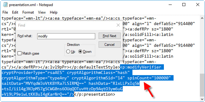 2-4. 찾기로 <p:modify~ 부분을 찾아서 <p:modify ~~~ ~~~ ~~~ /> 부분을 지우고 저장한 뒤 압축파일 내부의 파일과 바꿉니다. 수정한 presentation.xml파일이 압축 파일 내부과 교체된 상태여야 합니다.