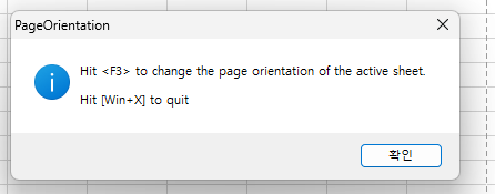 msgbox ,0x40, PageOrientation, Hit <F3> to change the page orientation of the active sheet.`n`nHit [Win+X] to quit