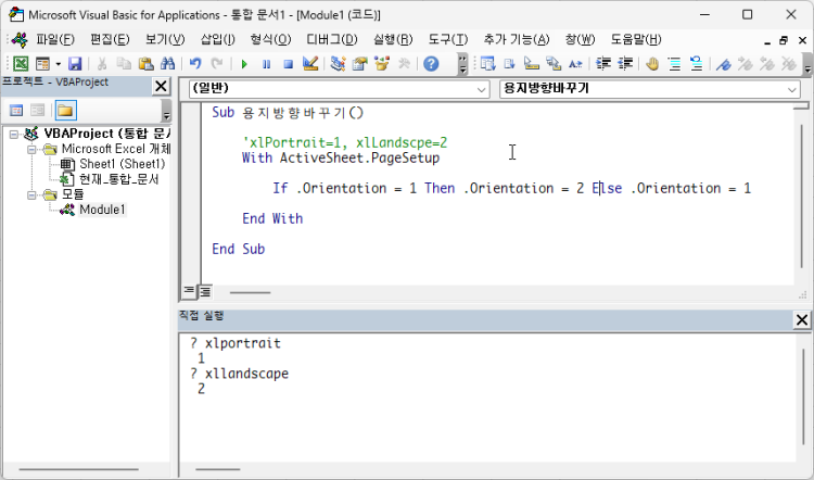 물론 좀 더 코드를 수정한다면 현재 페이지 설정을 확인하고 가로이면 세로로, 세로이면 가로로 바뀌게도 할 수 있겠습니다.